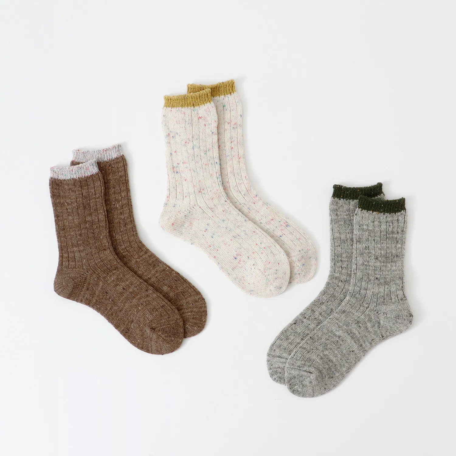 カラーネップ糸と防縮ウール糸をMIXして編み立てた、素材感が活きたソックス。