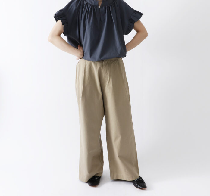フロントのタックの膨らみが立体感を出し、生地が程よくふんわりと広がって上品なシルエットに。低身長さんが着てもカジュアルすぎないきちんと感を出してくれます。
